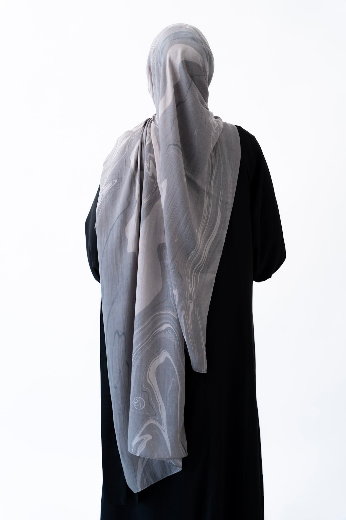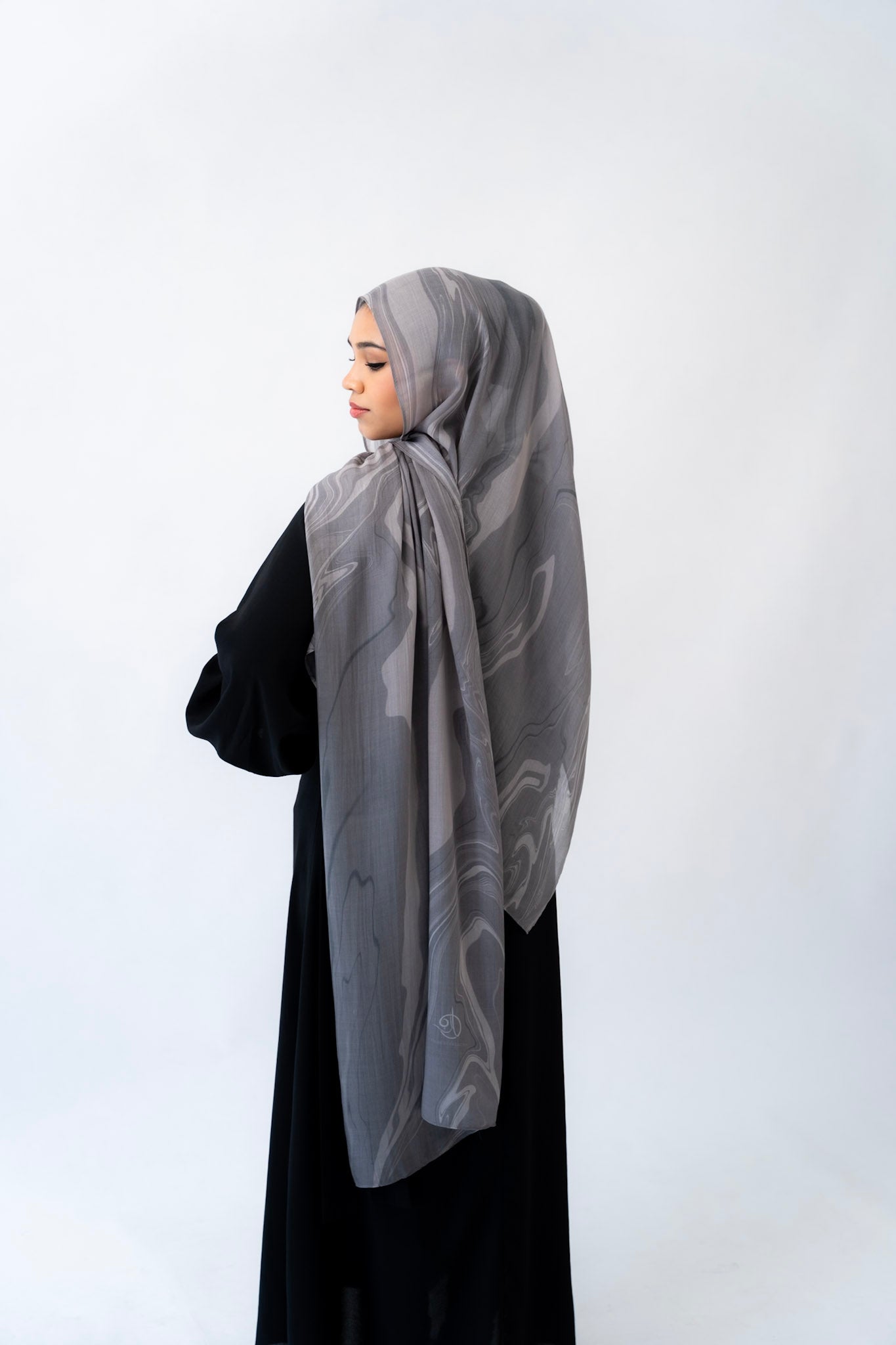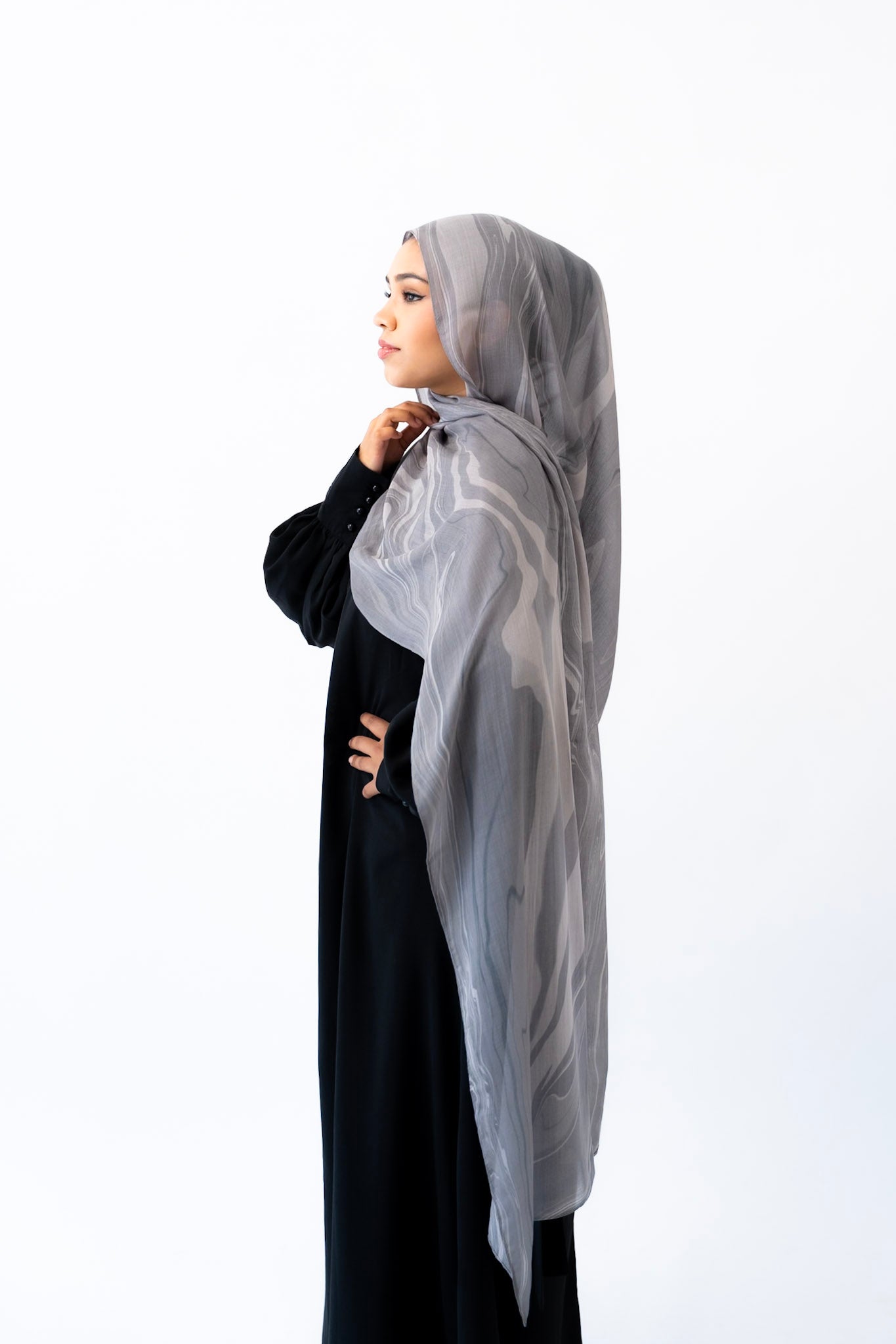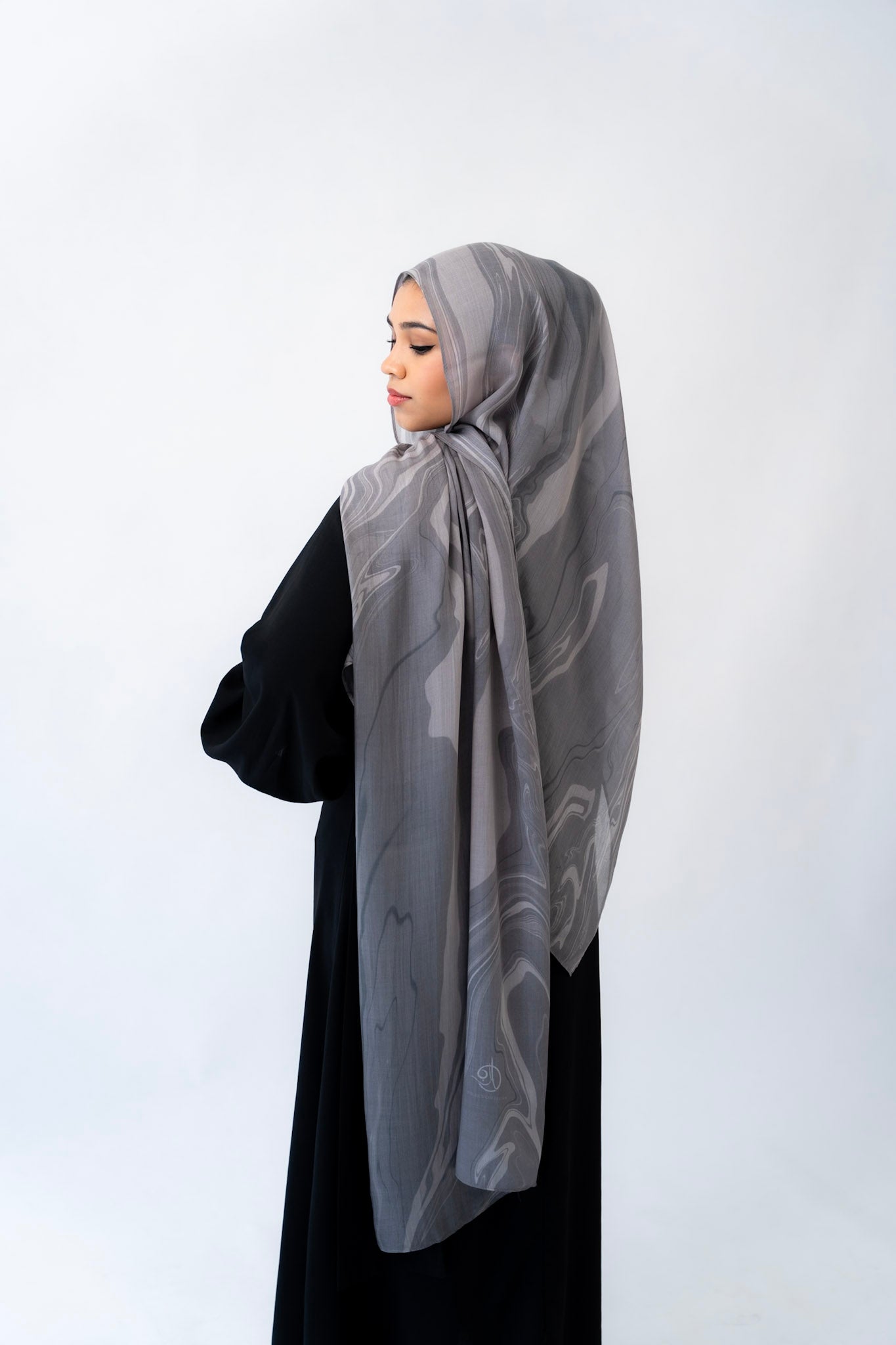 Inspired by the layered veining of Arabescato marble, this hijab is cool-toned, elegant, and quietly powerful. Its stormy hues and hand-drawn artistry make it a refined choice for both everyday wear and elevated occasions.