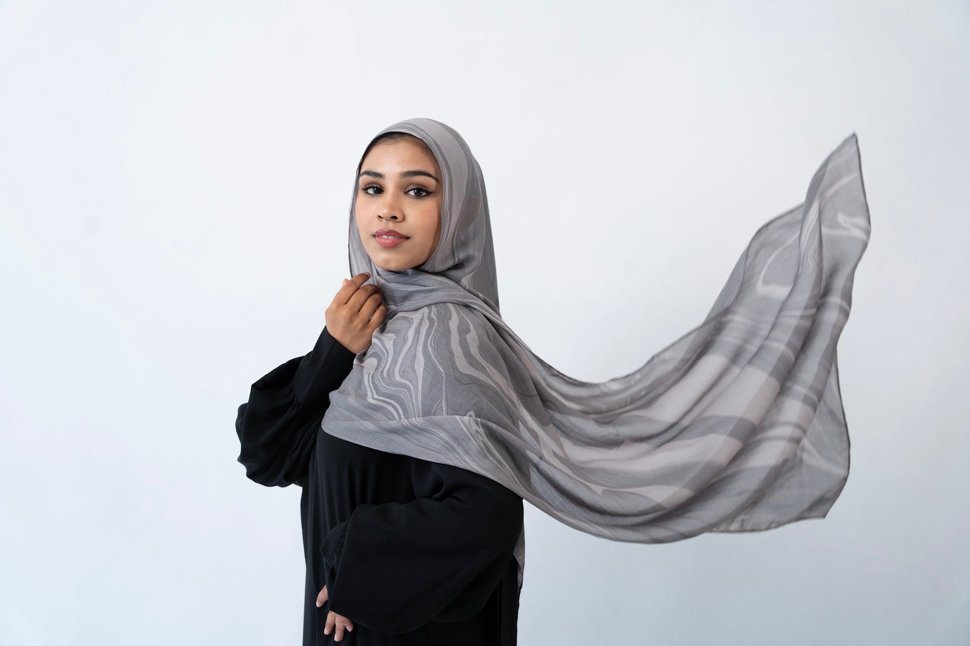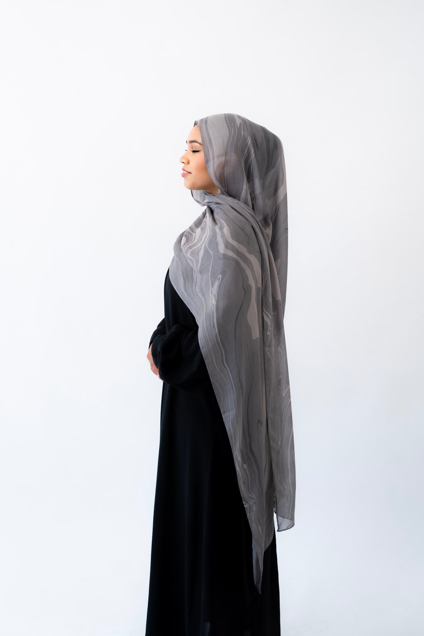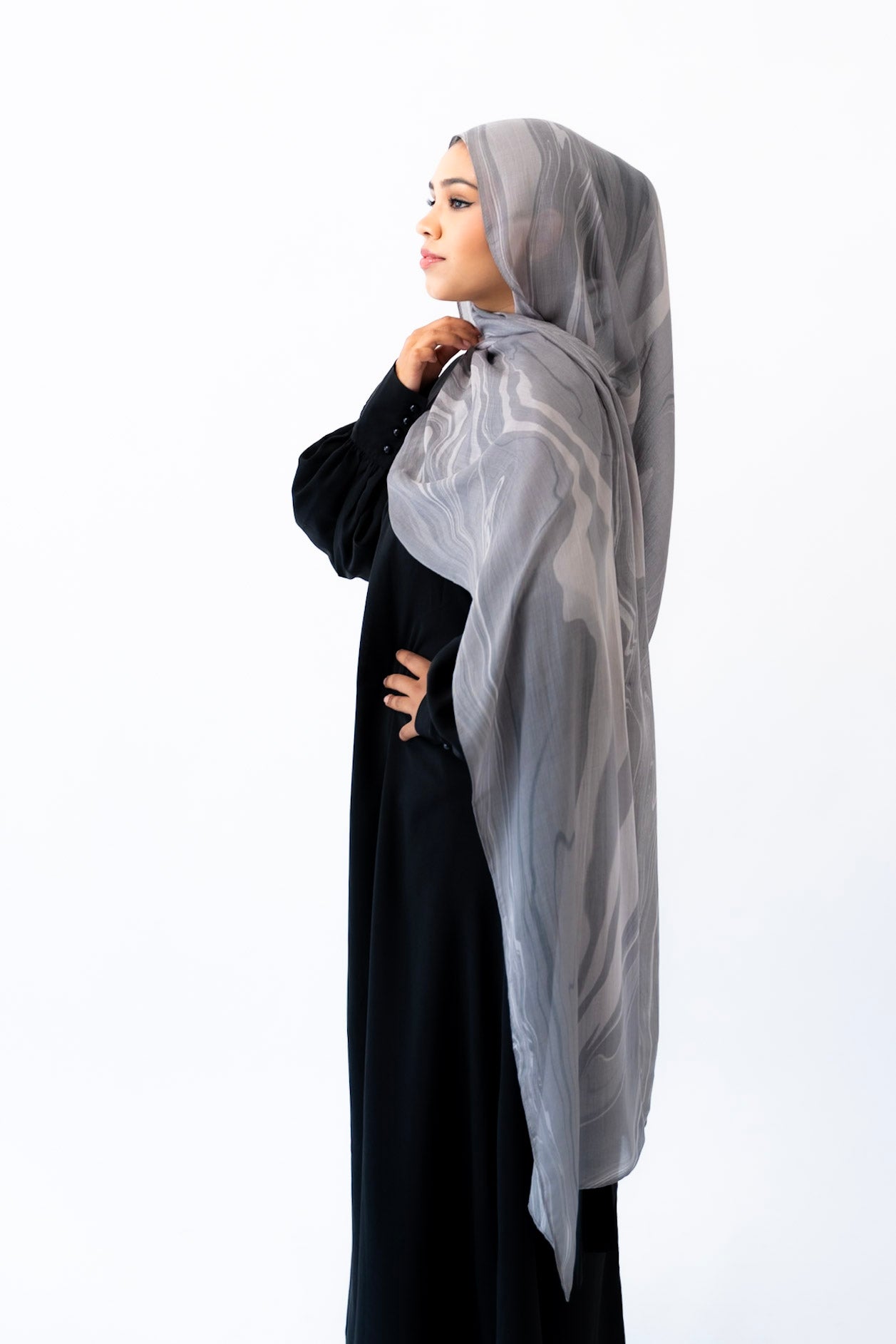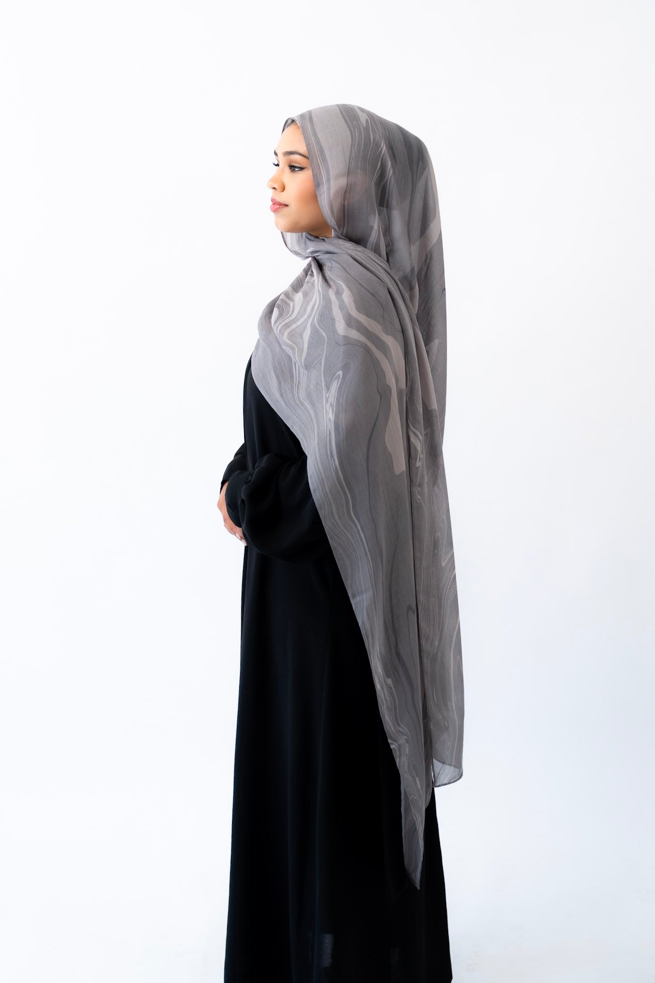 Inspired by the layered veining of Arabescato marble, this hijab is cool-toned, elegant, and quietly powerful. Its stormy hues and hand-drawn artistry make it a refined choice for both everyday wear and elevated occasions.