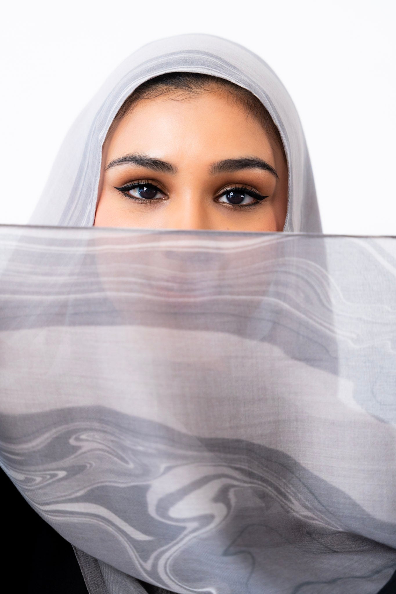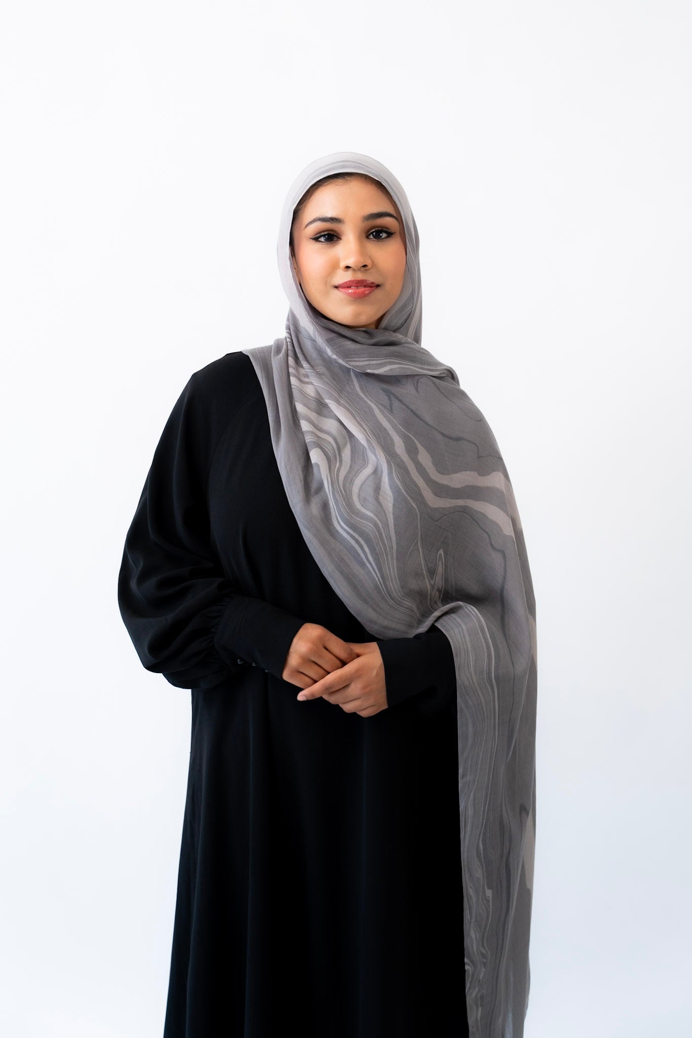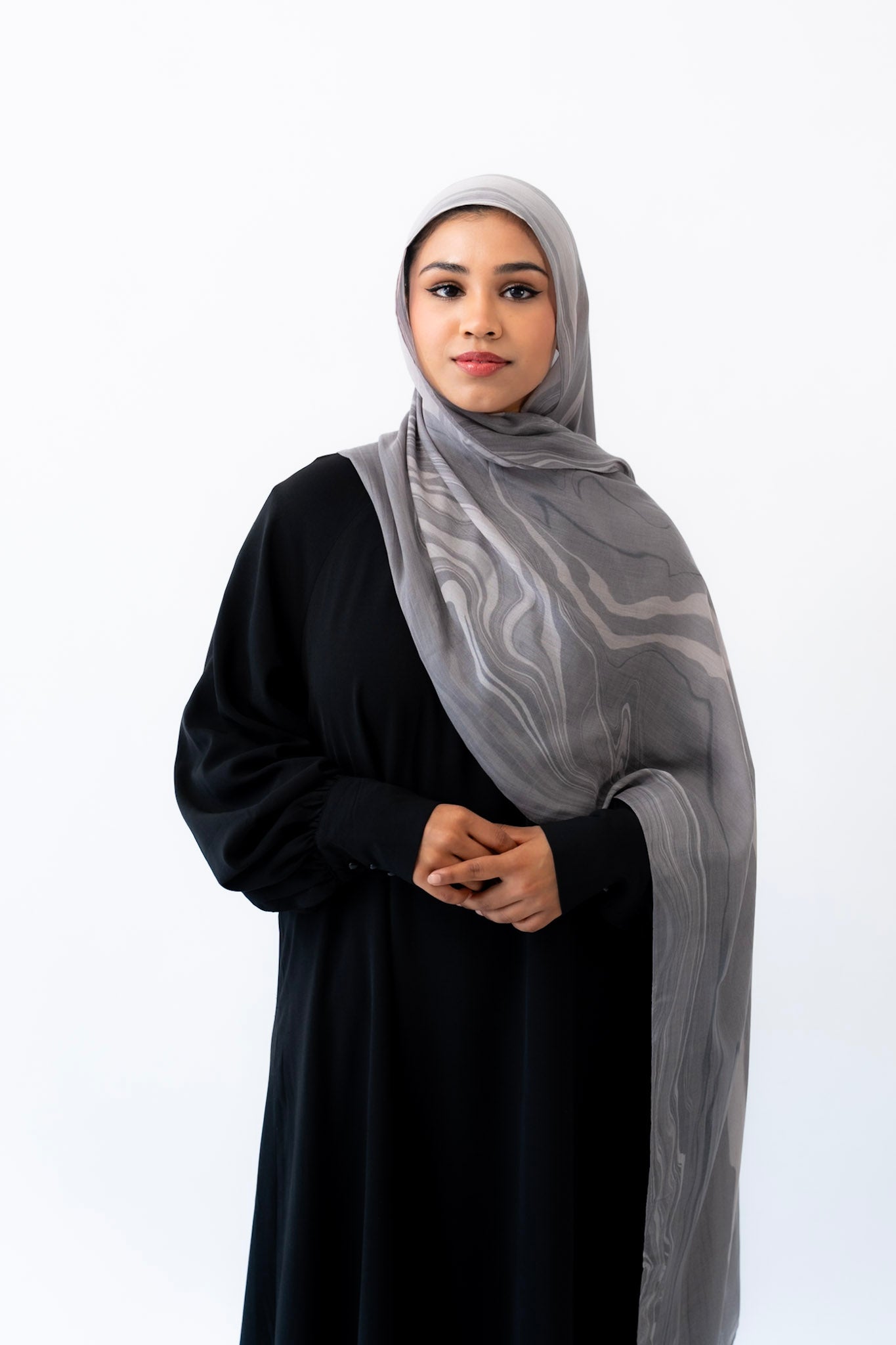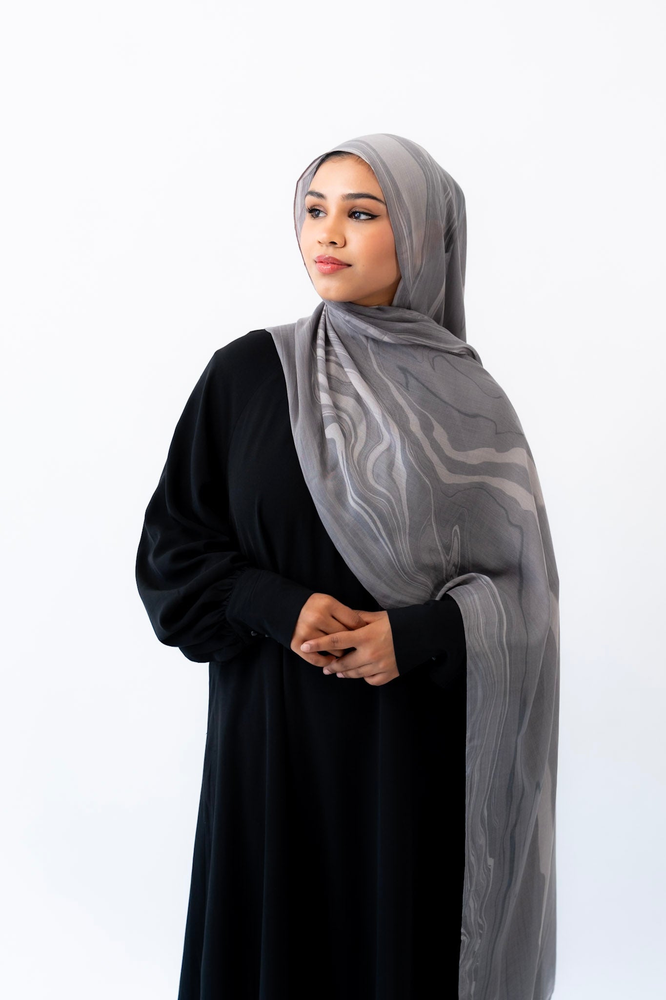 Inspired by the layered veining of Arabescato marble, this hijab is cool-toned, elegant, and quietly powerful. Its stormy hues and hand-drawn artistry make it a refined choice for both everyday wear and elevated occasions.